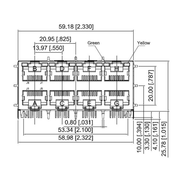 RJ45 2x4 Multiple Port Connectors with green yellow LED for 1G Network Switches